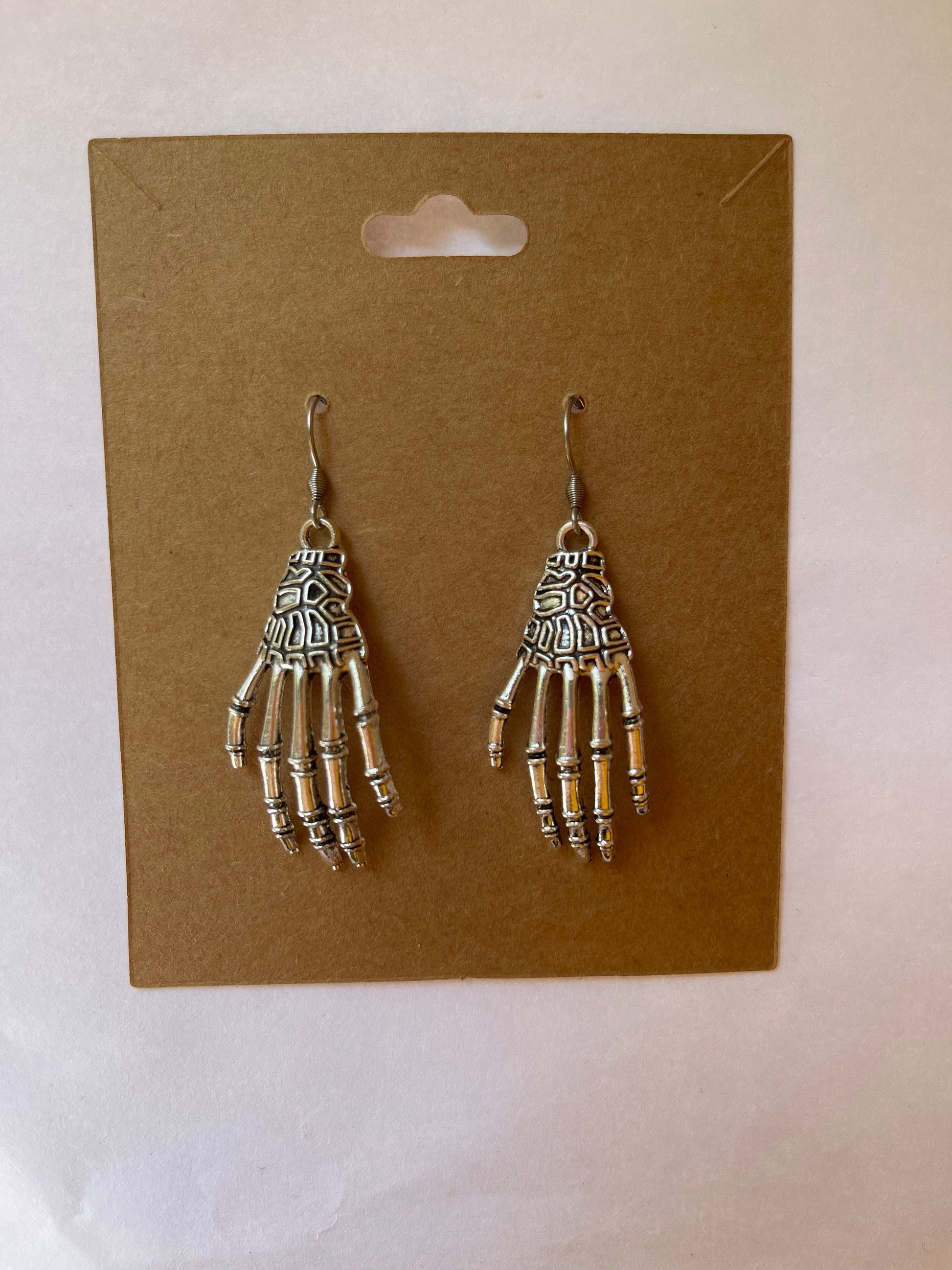 One pair of Skeleton hand earrings. Silver coloured hooks. Hand length 4 cm complete drop length about 4.5 cm.